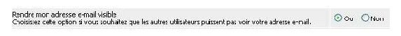 Cette option vous permet d'afficher ou nom votre adresse e-mail dans votre profile. Si vous choisissez de l'afficher les membres du forum et les visiteurs pourront y avoir accès. Cela permettra de vous contacter autrement que par Message Privé si vous le souhaitez.