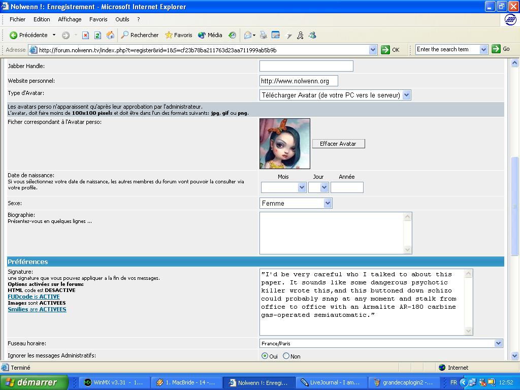 La page se rechargera et vous aurez une boîte de dialogue "parcourir" afin que vous puissiez sélectionner votre photo. Votre avatar ne doit pas dépasser les 40Ko et 100x100 pixels (taille de l'avatar montré sur cet exemple). Il existe des logiciels de retouche de photos disponibles gratuitement au téléchargement (voir telecharger.com). L'avatar sera ensuite soumis à approbation par l'administrateur. Vous recevrez un message privé lorsque celui-ci sera fait. Pour plus d'information concernant l'affichage des avatars, merci de consulter le sticker "A LIRE ABSOLUMENT A L'INSCRIPTION" situé dans la partie "Nolwenn !".