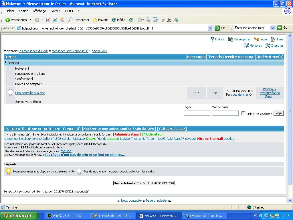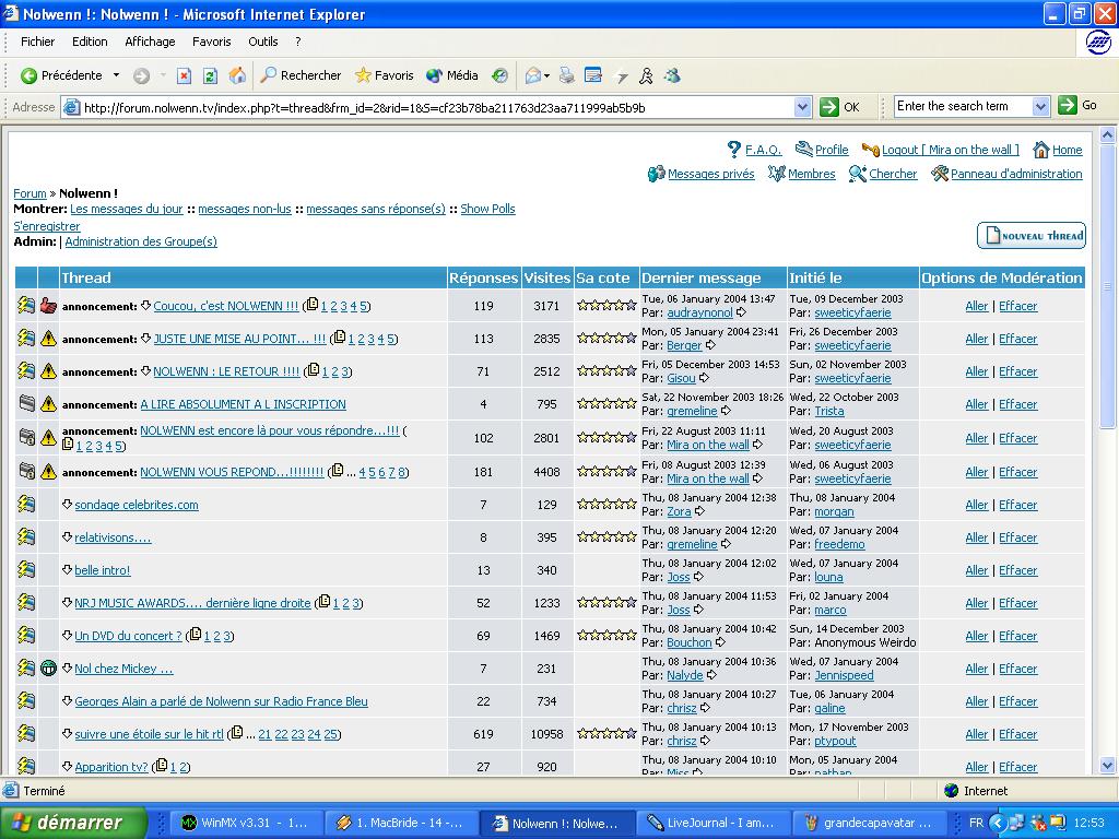 Voici une page extraite de la section générale, "Nolwenn". C'est ainsi que vous visualiserez les posts déjà postés, et que vous pourrez les lire. Il suffit de cliquer sur le titre du post pour pouvoir y accéder. Pour répondre à un message, il suffit de cliquer sur "répondre" en bas d'un message. Pour poster un message, il suffit de cliquer sur "nouveau thread" en haut de la page.