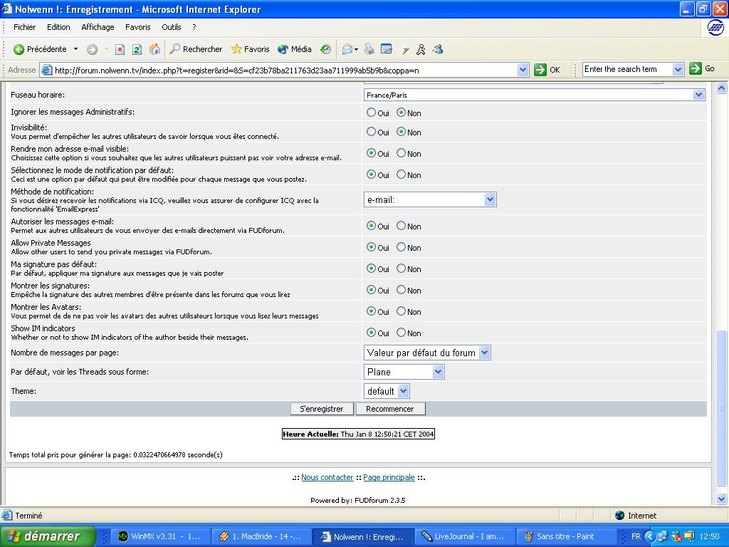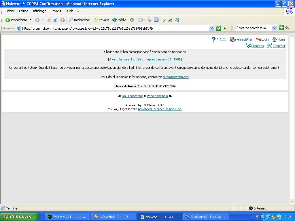 Cette page préalable à l'inscription vous demande votre âge. En effet selon la législation Internet en vigueur un mineur de moins de 13 ans ne peut accéder aux forums de discussion sans l'accord préalable d'un tuteur. Cependant nous prenons la responsabilité des mineurs de moins de 13 ans s'inscrivant sur votre forum. Donc faites attention de bien cliquer sur "né avant le 11 janvier 1991" lorsque vous souhaitez vous inscrire.