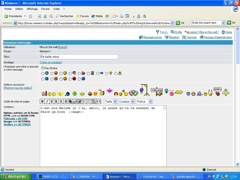 Voici ce à quoi vous faites face lorsque vous répondez à un message. Vous disposez de plusieurs options pour mettre votre message en forme. Tout d'abord vous pouvez choisir un smiley correspondant à l'humeur de votre message et qui sera visible dans l'affichage général des posts de la section, afin d'informer les utilisateurs de quoi il retourne.