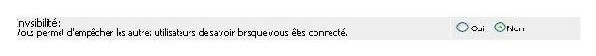 L'invisibilité vous permet de ne pas être vu dans les utilisateurs connectés sur le forum. La page d'entrée affiche tous les utilisateurs connectés en ce moment sur le forum ; cette option ne vous affichera. Si vous postez ou si vous envoyez des Messages Privés avec cette option, le petit bonhomme sera gris ; et sera orange si vous décidez d'être visible. Quoi que vous choisissez, vous serez toujours visible pour les administrateurs.